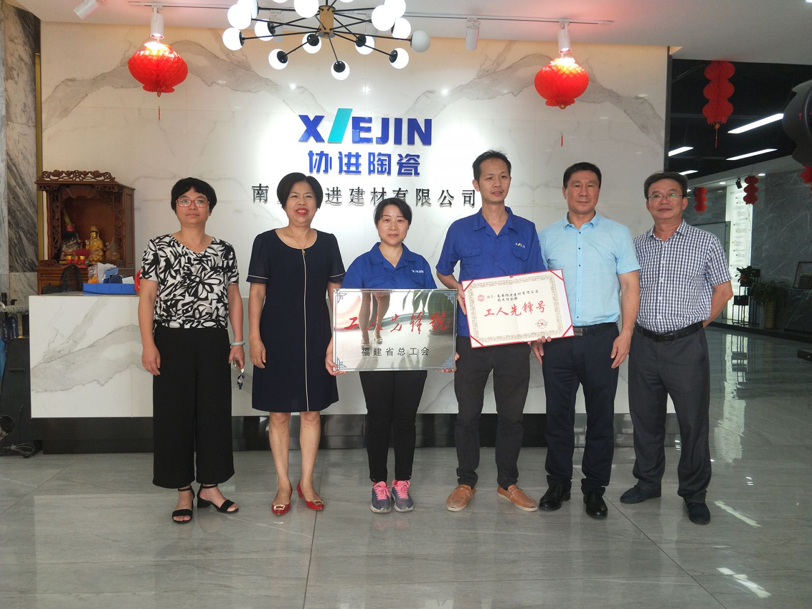 2019年5月16日下午,南安市總工會黨組書記常務副主席黃海鷹在鎮工會主席李彩芳的帶領下,特地來公司為技術綜合部頒發省級“工人先鋒號”匾牌。公司技術綜合部,瞄準市場需求,攻克技術難題,銳意進取,在外墻、內墻、大板、薄板等瓷磚領域的技術上都有新的突破。被福建省總工會評為五一“工人先鋒號”。