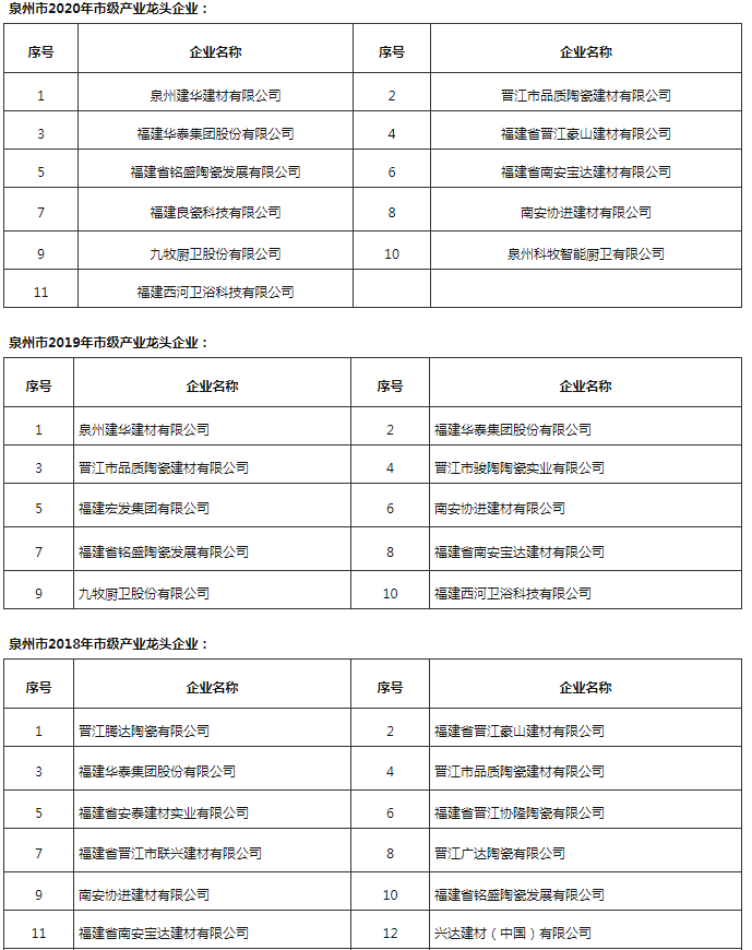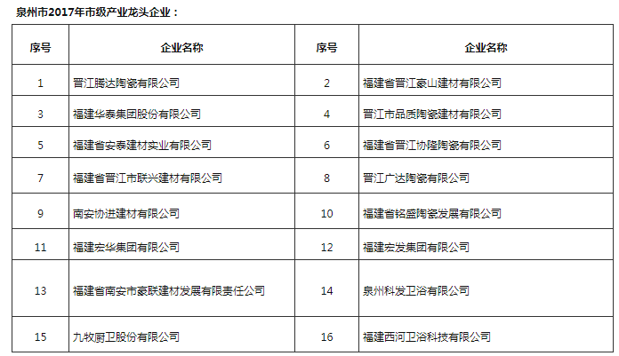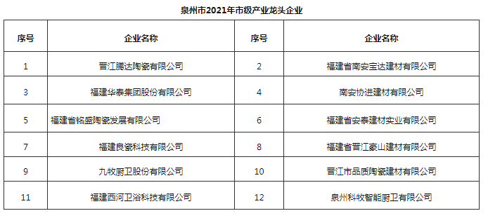 其中,建材家居行業中,協進、九牧等12家福建陶衛企業進入2021年泉市級產業龍頭企業項目名單。